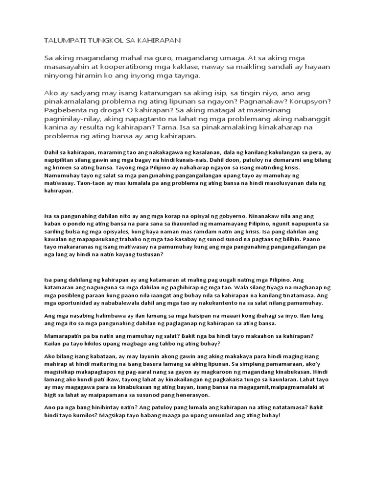 Di pa huli ang lahat para sayo Droga ay hindi sagot sa problema mo. Ang katotohanang ito na aking nasaksihan tungkol sa kahirapan na kinakaharap ng ating lipunan ay taliwas sa nakikita ko sa telebisyon. Talumpati tungkol sa kahalagahan ng pamilya.
