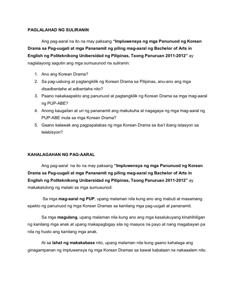 Walang matiyagang lalaki Sa pihikang babae. Una ay ang magpahinga o matulog para may lakas sila upang ipagpatuloy. Sanligan ng Pag-aaral ----- 1- 2 Paglalahad ng Suliranin ----- 3 Haypotesis ----- 4 Kahalagahan ng Pag-aaral ----- 5-6 Depinisyon ng Termino ----- 78 Kaugnayan ng pag-aaral ----- 9 Kaugnayan ng Literatura ----- 10 Pasasalamat Isang malaking pasasalamat sa mga taong walng pag- alinlangang tulongan kami sa pananaliksik na ito.