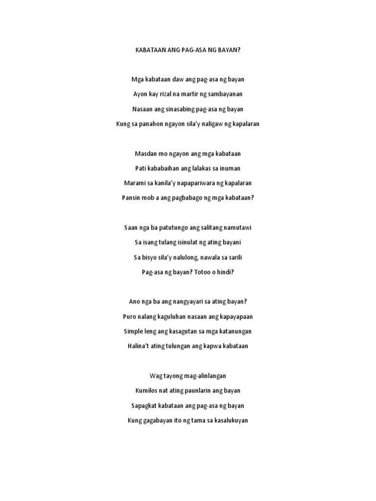Kahit sa ating henerasyon makikita mo ang malaking pag-angay ng teknolohiya at antas ng pamumuhay. Kundi man sasapat ang bisa ng aking kalasag Upang supilin ang banta ng panganib Ipag-antanda mo ako sa tapat ng altar At damayan sa puspos na pananalangin. Tayong mga kabataan ay ang siyang pag-asa ng bayan tayo nang mag-aral ng mabuti upang ang kahirapan ay wakasan at pag-unlad ay atin ng simulan.