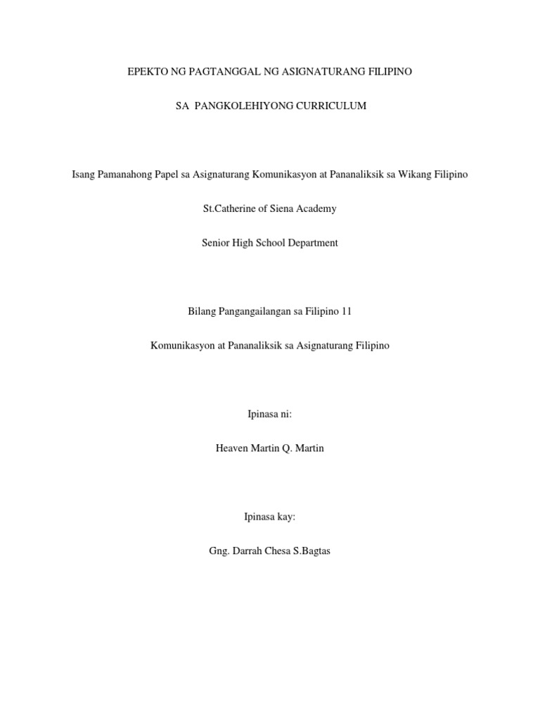 Epekto Ng Pagtanggal Ng Asignaturang Filipino Pdf