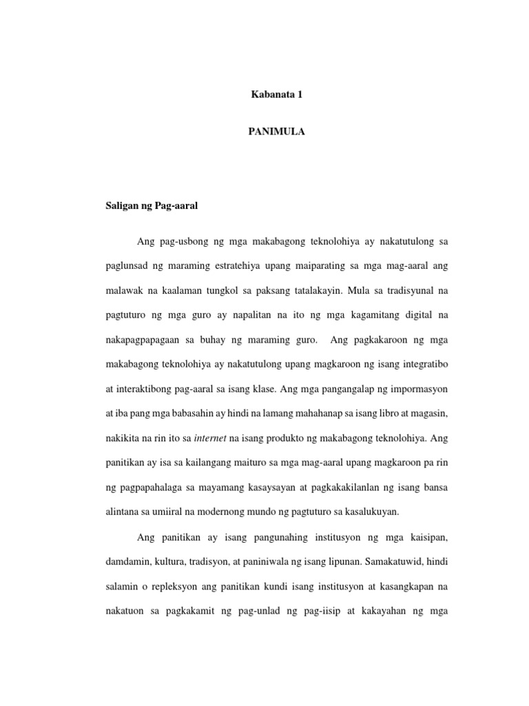 EPEKTO NG TEKNOLOHIYA SA PAG-AARAL NG MGA MAG-AARAL Isang reserts report na iniharap sa mga dalubguro bilang pangangailangan para sa asignaturang Fil109 ni DONALD COGO KOLEHIYO NG SKSU KALAMANSIG SULTAN KUDARAT ENERO 10 2014 KABANATA 1 PANIMULA Tungkulin ng mga kabataan ang mag-aral kapag ang mga kabataan ay napapagud. Huwag tayong maging manhid o magbulag-bulagan sa mga pagbabagong ito. Paggamit ng Teknolohiya sa Edukasyon.