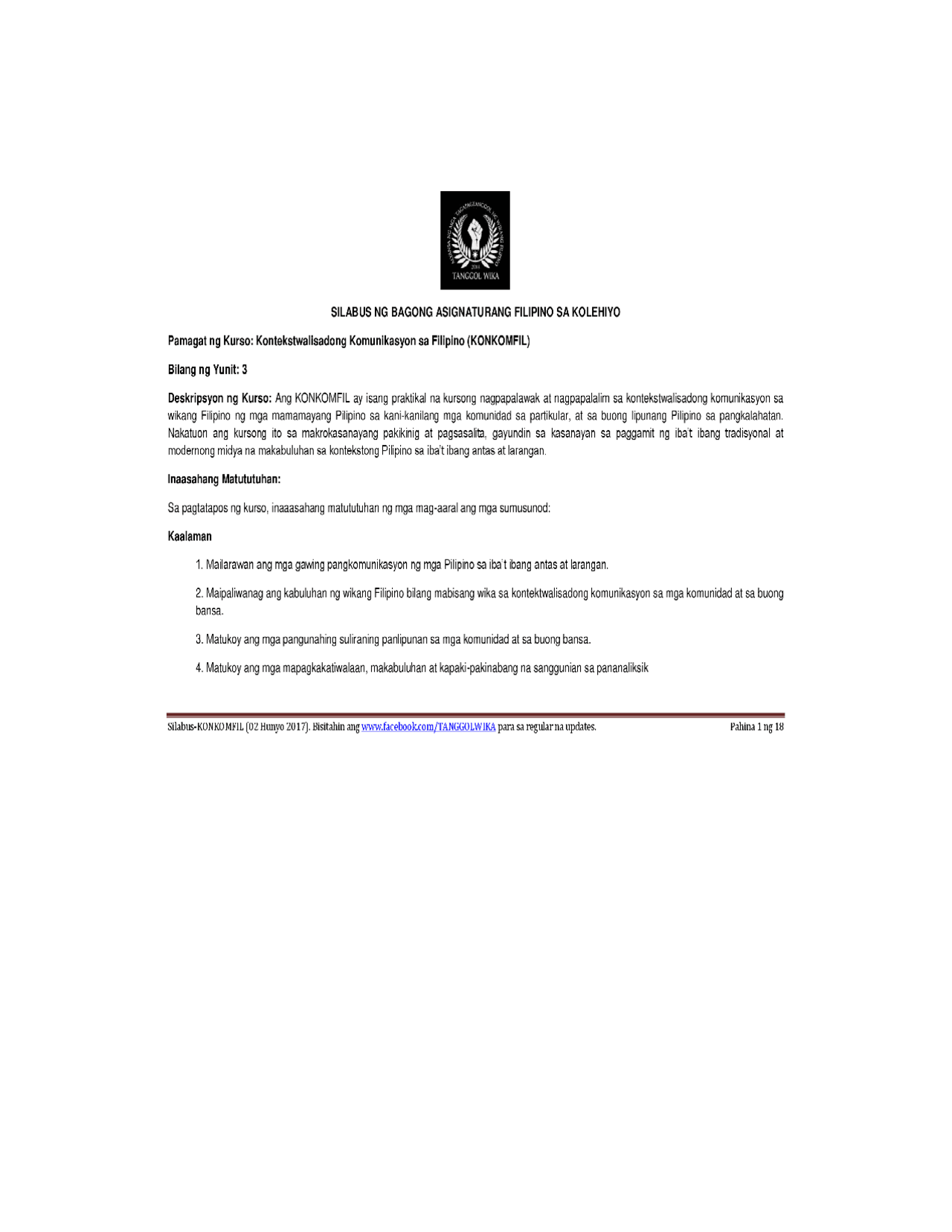 Itoy isang praktikal na kursong nagpapalawak at nagpapalalim ng isyung panlipunan sa kani-kanilang mga komunidad sa partikular at sa buong lipunang Pilipino sa pangkalahatan. Score at least Must score at least to complete this module item Scored at least Module item has been completed by scoring at least View Must view in order to complete this module item Viewed Module item has been viewed and is complete Mark done Must mark this module item done. Ang Kontekstwalisadong komunikasyon ay isang paraan sa paggamit ng wikang Filipino sa pagsasalita sa kapwa niya tao at pagsusulat gamit ang wikang Pilipino.