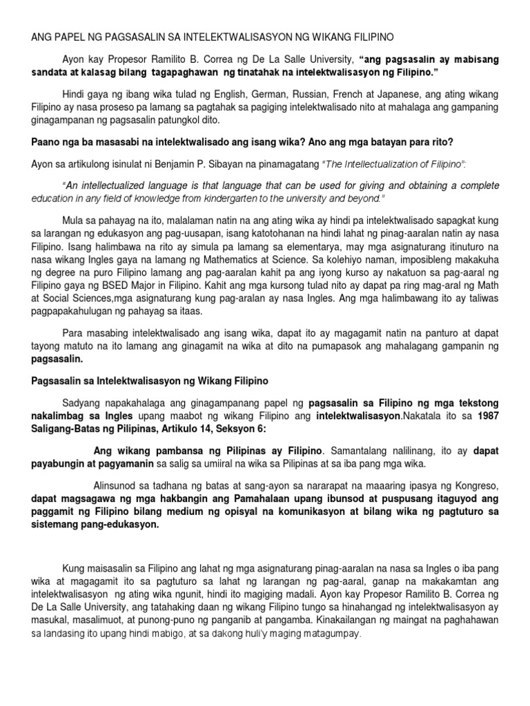 Ang Papel Ng Pagsasalin Sa Intelektwalisasyon Ng Wikang Filipino Pdf